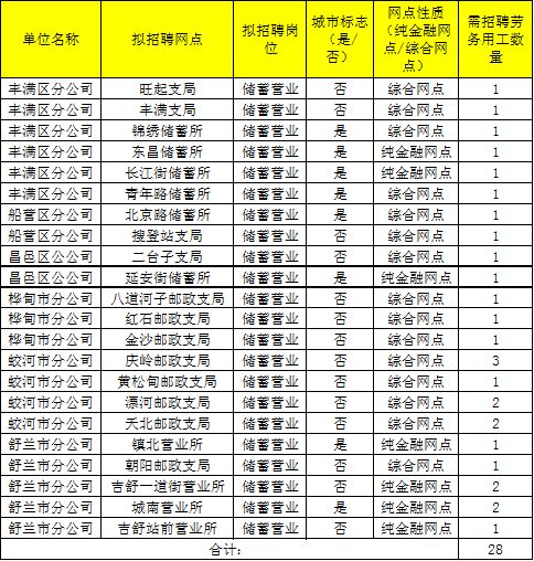 因业务持续发展和市场开拓需要,经与合作的中国邮政集团公司吉林市分公司共同研究,拟面向社会招聘28名劳务派遣用工,派遣到中国邮政集团公司吉林市分公司所属网点工作。