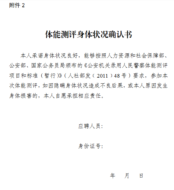1.具体时间和地点另行通知。参加测评的考生,须携带《笔试成绩单》、《体能测评成绩单》、有效期内二代居民身份证(临时身份证或社会保障卡)、《体能测评身体状况确认书》(附件2)。未携带有效证件或不按规定时间、地点参加体能测评的考生,视为自动放弃体能测评资格。