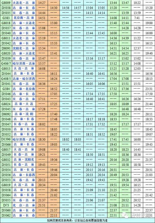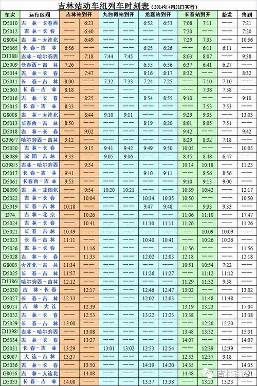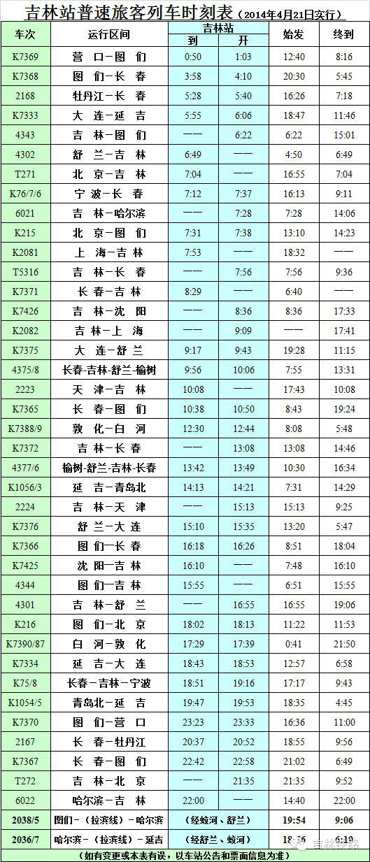 自2014年4月21日零时起,哈大高铁实施夏季图,沈阳局调整管内运行图,吉林站列车时刻主要变化: