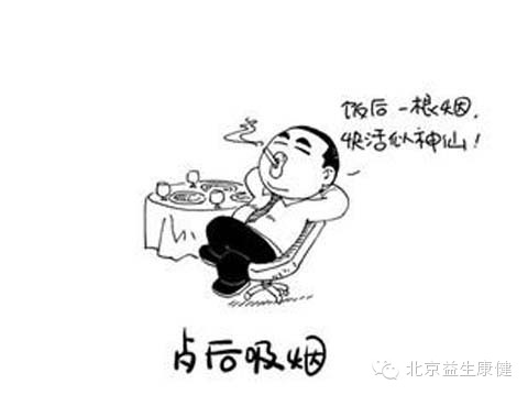饭后吸一支烟,中毒量大于平时吸十支烟的总和。因为人在吃饭以后,胃肠蠕动加强,血液循环加快,这时人体吸收烟雾的能力进入“最佳状态”,烟中的有毒物质比平时更容易进入人体,从而更加重了对人体健康的损害程度。