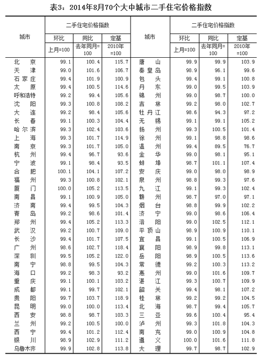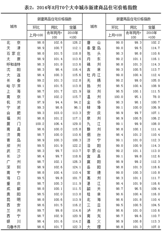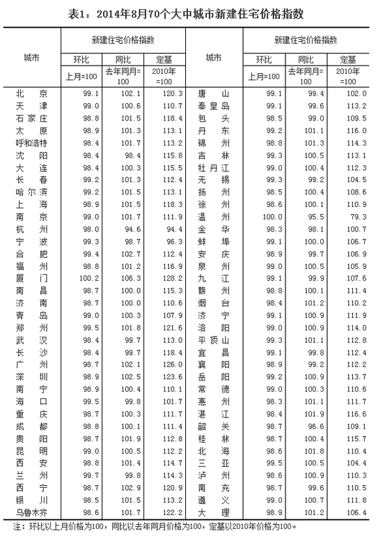 从同比来看,70个大中城市中,价格下降的城市有32个,持平的城市有1个,上涨的城市有37个。8月份,同比价格变动中,厦门、郑州、深圳涨幅最高,为5.2%;在价格下降的城市中,温州最低为下降10.5%,牡丹江为5.7%。
