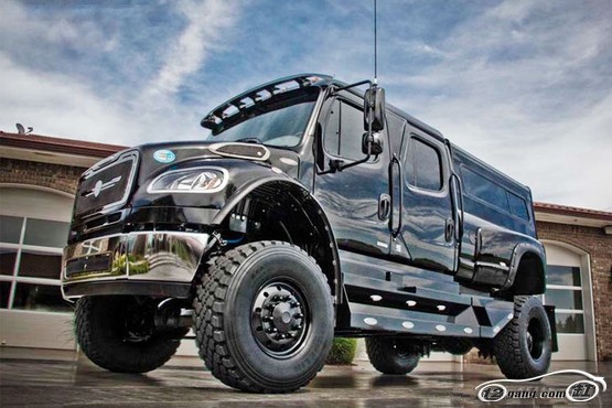 由美国SportChassis改装车公司基于Freightliner M2载重卡车底盘打造。其车头保留了原型车的拖车车头,车声长6.65米,车高接近3米。该车采用康明斯8.3L排量柴油发动机,最大功率330马力,最大扭矩1355牛米,配合可放大扭矩的TRV3200变速箱,该车几乎可以通过任何陆地地面。为了能够保证在公路行驶时的舒适性,在底盘与车身连接部位使用了尺寸惊人的气压避震系统。为了满足不同国家对于方向盘位置的要求,该车设计了一套完全对称的中控仪表台,可以方便地改变方向盘位置。
